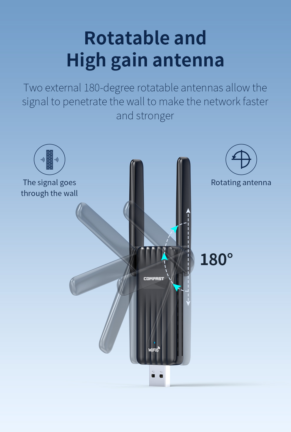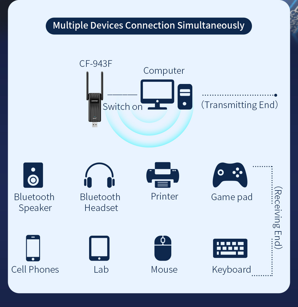 The CF-943F is a dual-band WiFi 6 Bluetooth adapter delivering speeds up to 900Mbps for high-speed connectivity. Featuring two adjustable external antennas and Bluetooth 5.4, it provides extended coverage and stable links. This plug-and-play card also supports AP mode, making it an ideal wireless solution for desktops and laptops in homes and dormitories.