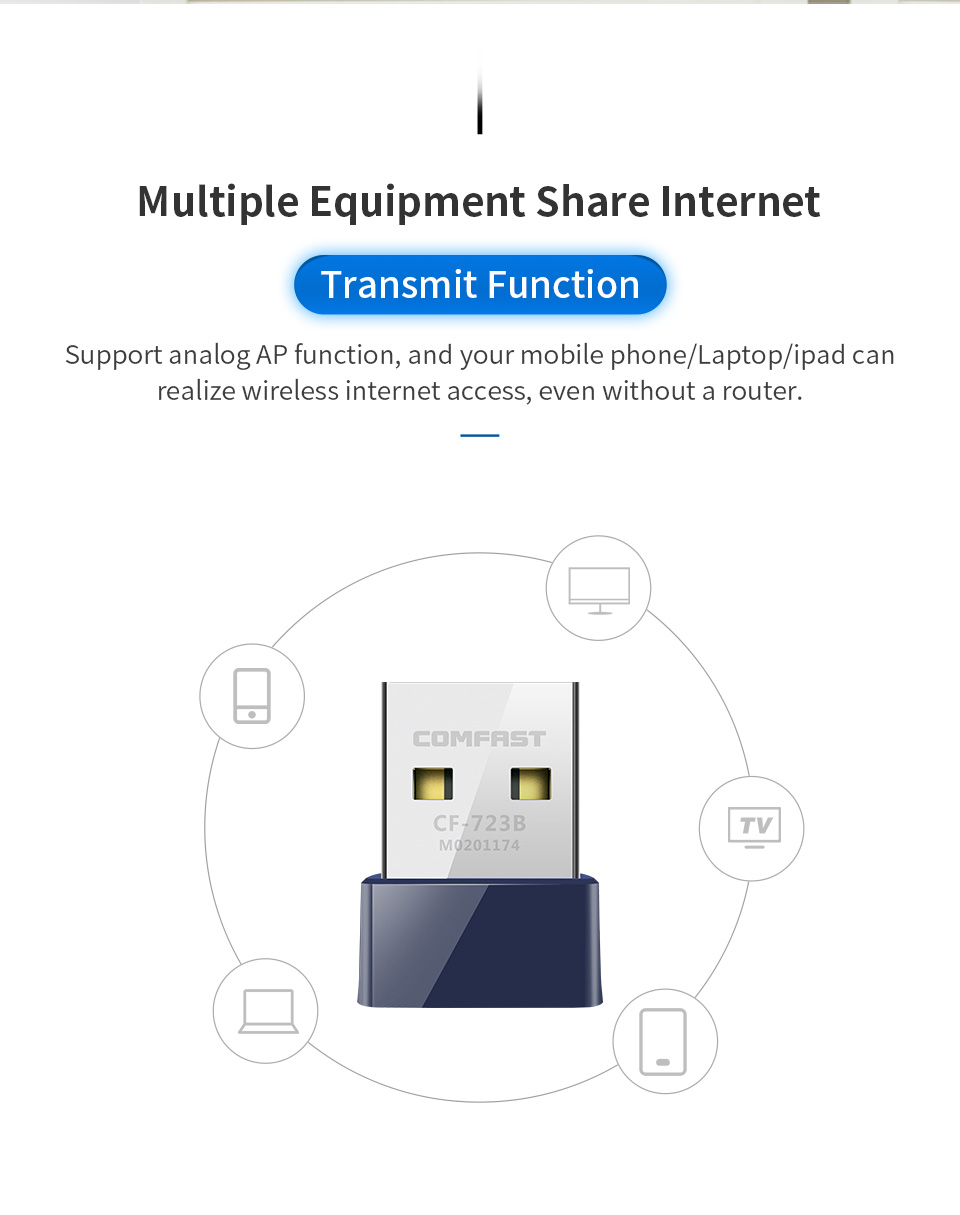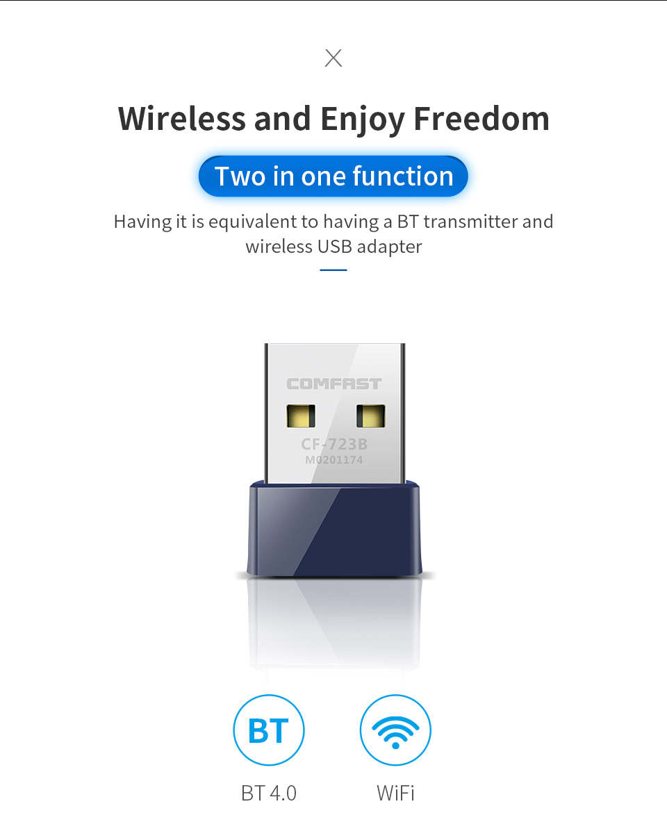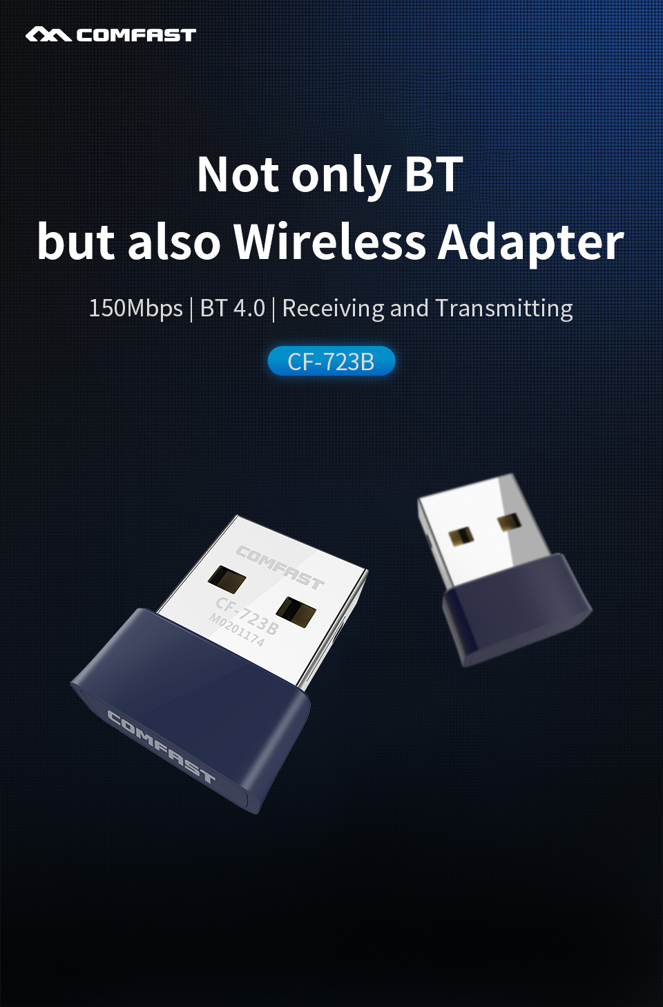 The CF-723B is a wireless network adapter integrated with Bluetooth functionality. Beyond its core capabilities of WiFi reception and transmission as a standard wireless adapter, it enables devices without built-in Bluetooth to instantly gain versatile Bluetooth applications—such as connectivity with Bluetooth speakers, headphones, and other compatible peripherals.
