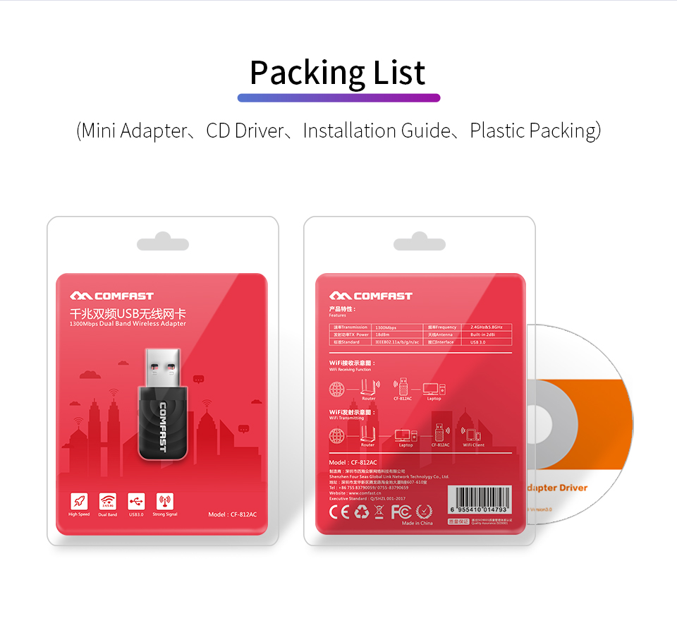 CF-812AC is a dual-band wireless adapter delivering speeds of up to 1300 Mbps. Featuring a USB 3.0 interface and a low-power, energy-efficient design, it adopts the latest 802.11ac/n/g/b/a wireless technology. It supports selectable 2.4 GHz and 5.8 GHz frequency bands with strong anti-interference capabilities and powerful signal performance, making it suitable for offices, homes, dormitories, hotels, and many other environments.