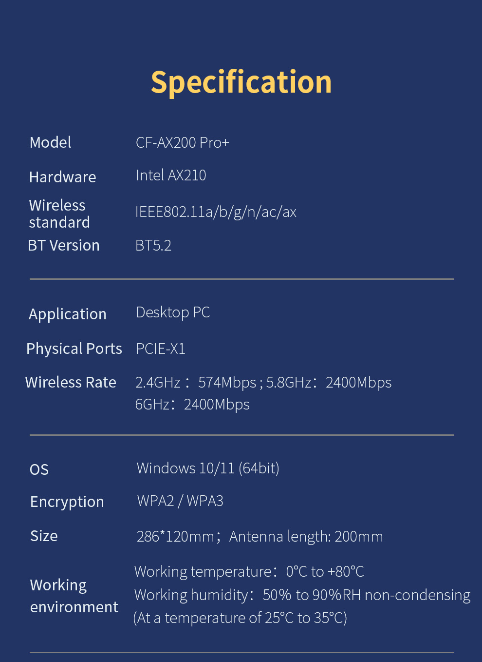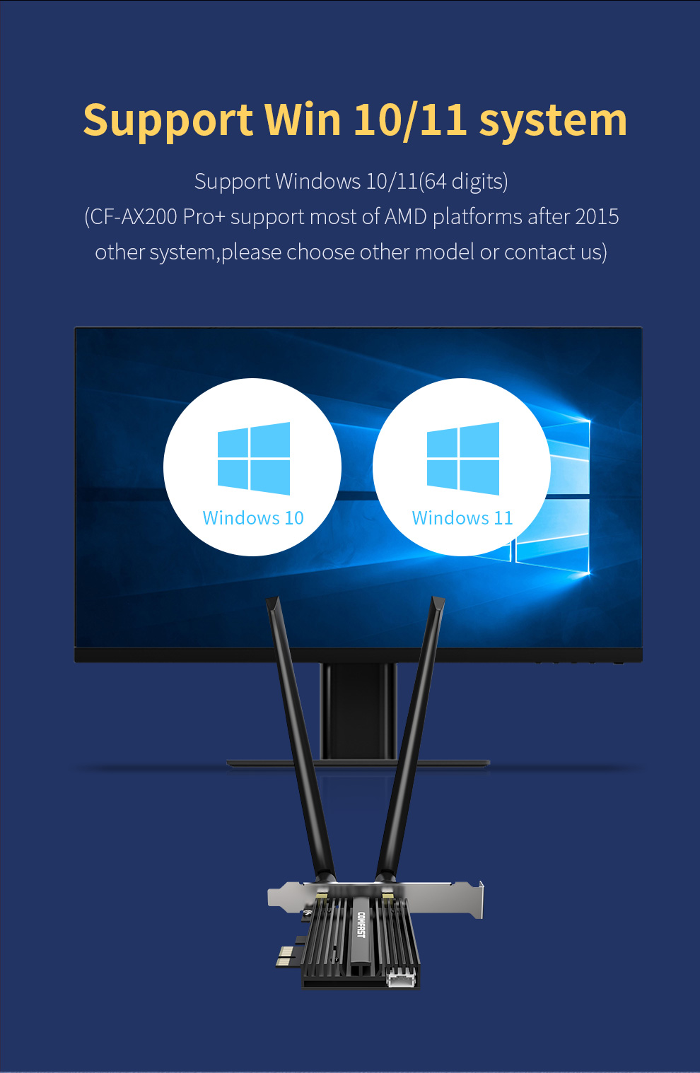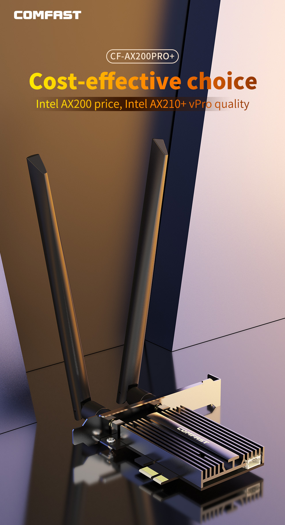 The CF-AX200 Pro is a PCI-E network card with WiFi 6, 2974Mbps dual-band (2.4 & 5.8GHz), and Bluetooth 5.2, perfect for WiFi 6 routers.