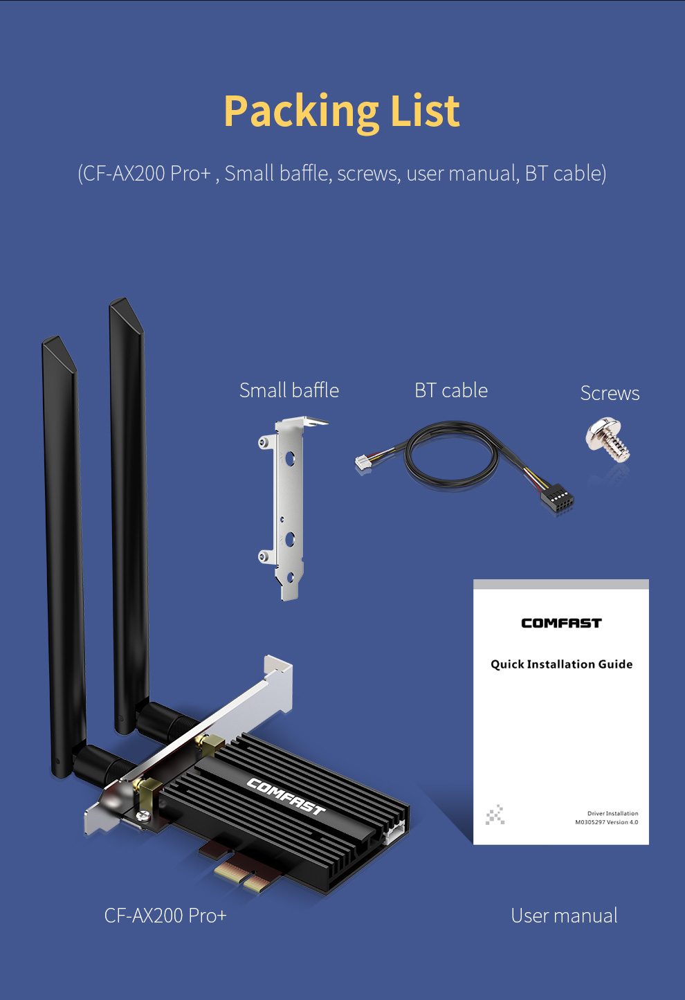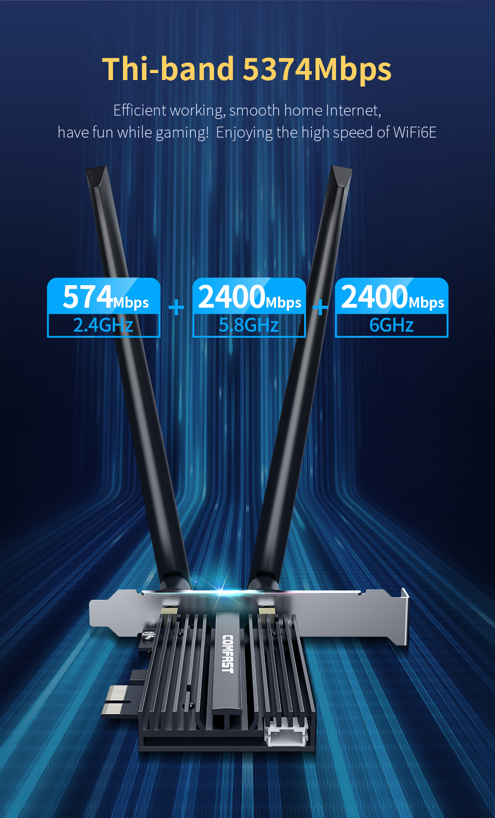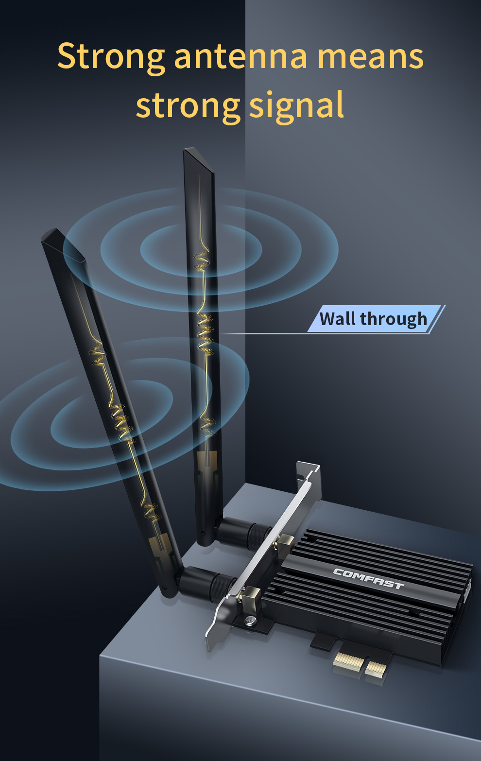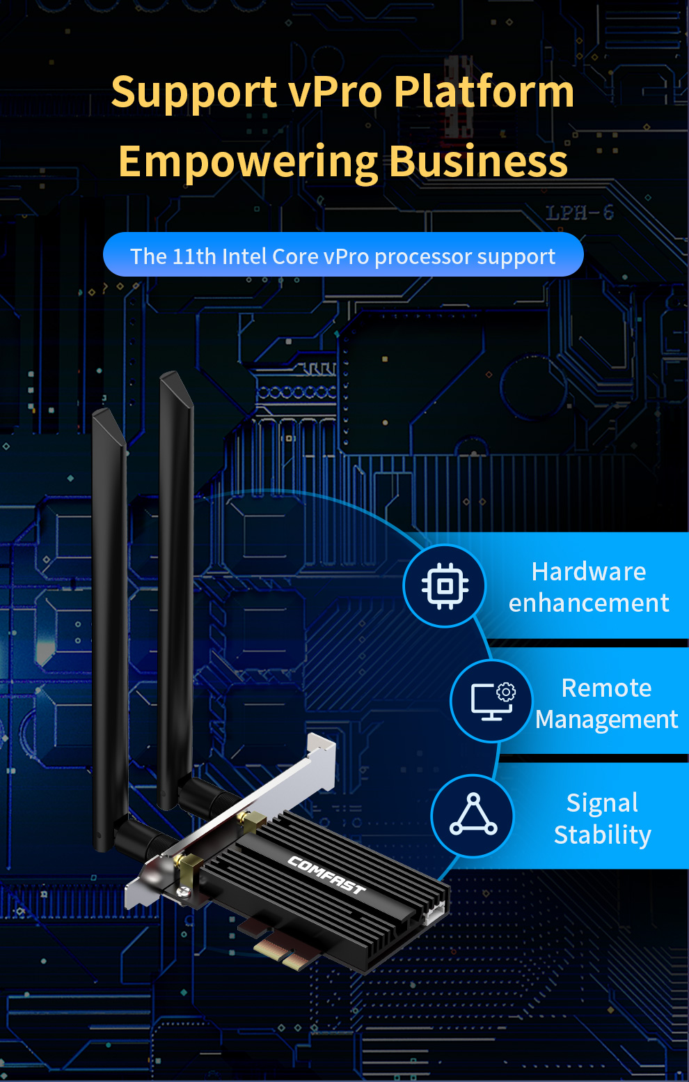 The CF-AX200 Pro is a PCI-E network card with WiFi 6, 2974Mbps dual-band (2.4 & 5.8GHz), and Bluetooth 5.2, perfect for WiFi 6 routers.