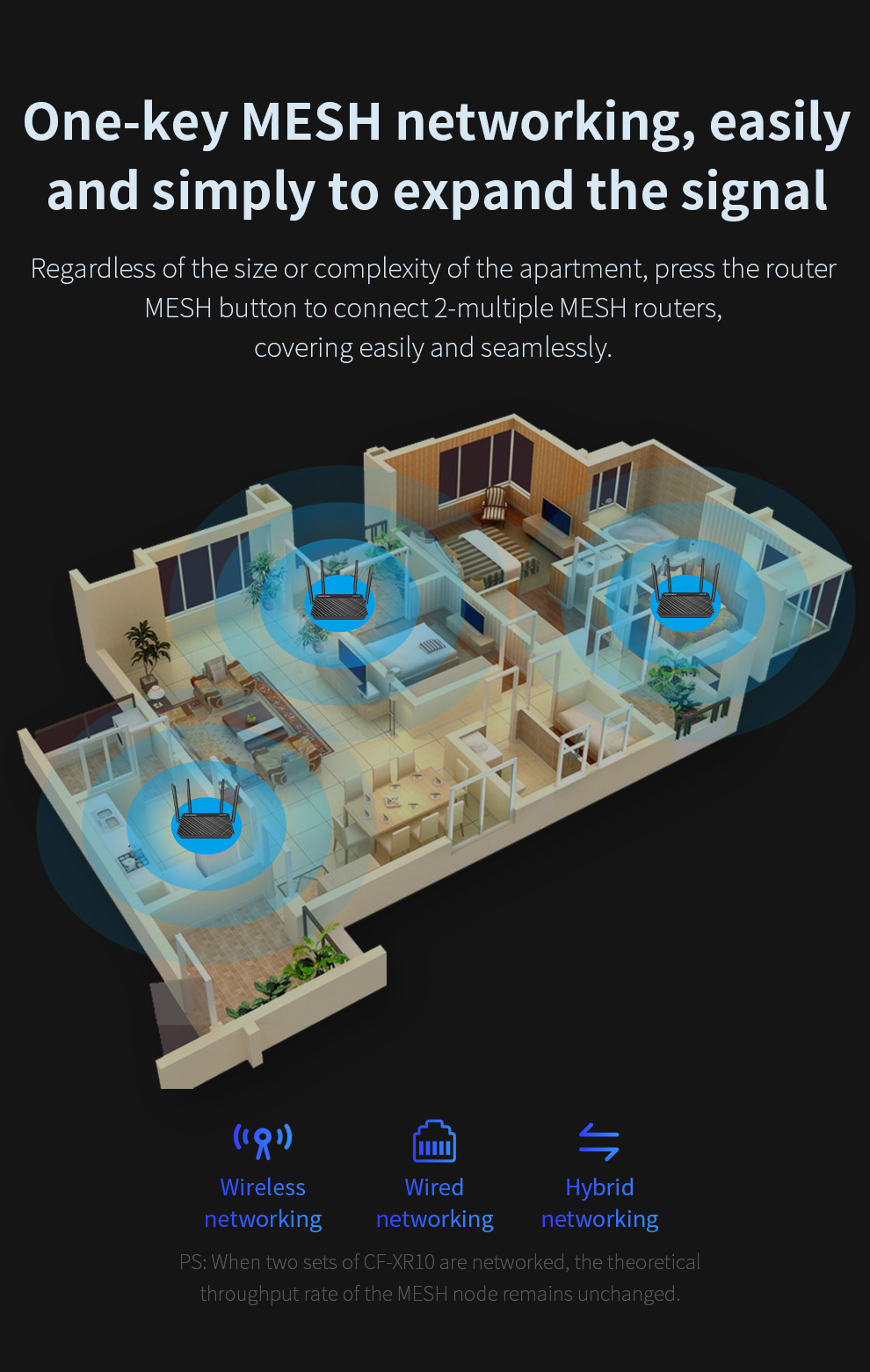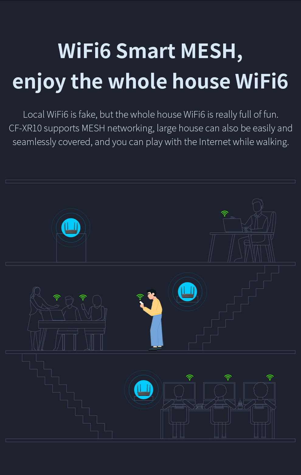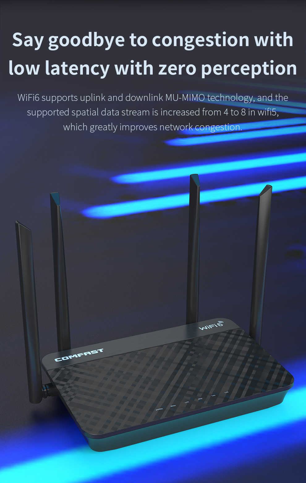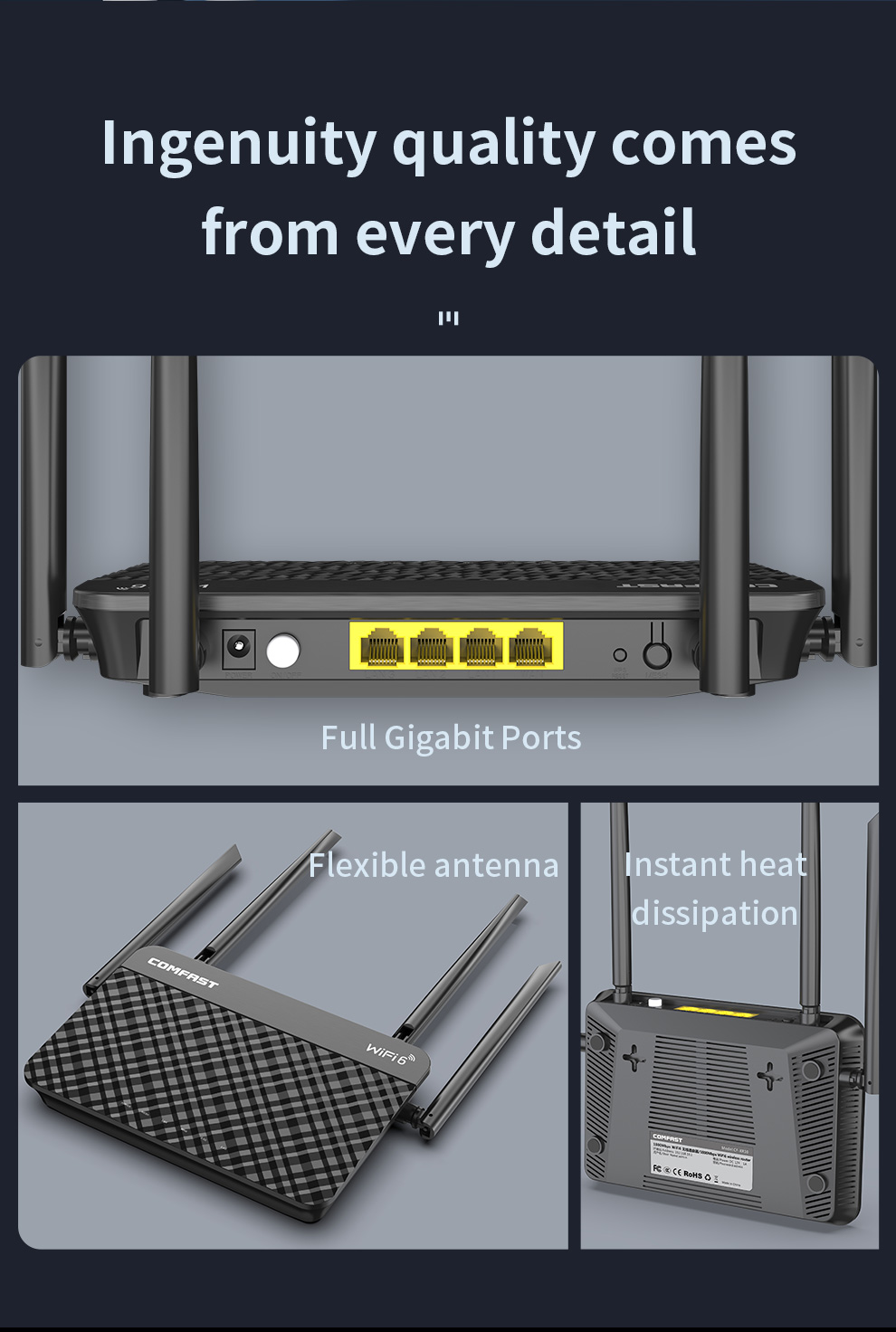*The product images and demonstration scenarios on this page are for illustrative purposes only and may have slight differences from the actual product. Please refer to the physical product for accuracy. *The data on this page are theoretical values obtained from COMFAST’s internal laboratory under specific testing conditions. Actual usage may vary due to individual product differences, software versions, usage conditions, and environmental factors. Please refer to real-world usage for accurate representation. *To provide as accurate product information, specifications, and features as possible, COMFAST may periodically adjust and revise the text descriptions, image effects, and other content on this page to ensure alignment with actual product performance, specifications, packaging, and accessories. Should such adjustments or revisions become necessary, no prior notice will be provided.