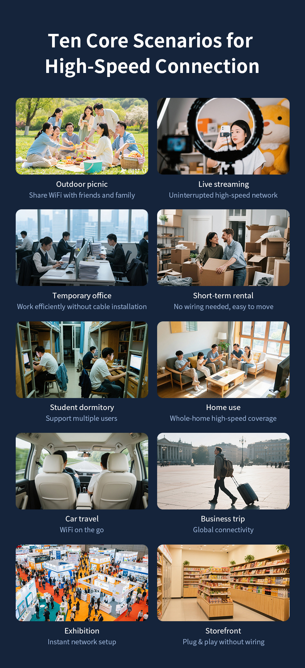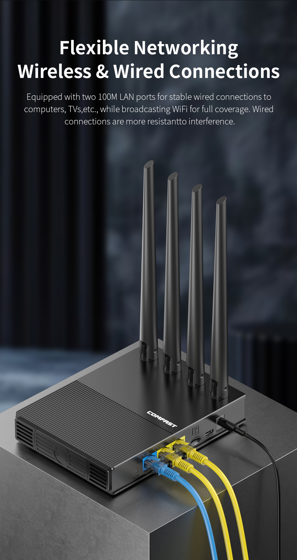*The product images and demonstration scenarios on this page are for illustrative purposes only and may have slight differences from the actual product. Please refer to the physical product for accuracy. *The data on this page are theoretical values obtained from COMFAST’s internal laboratory under specific testing conditions. Actual usage may vary due to individual product differences, software versions, usage conditions, and environmental factors. Please refer to real-world usage for accurate representation. *To provide as accurate product information, specifications, and features as possible, COMFAST may periodically adjust and revise the text descriptions, image effects, and other content on this page to ensure alignment with actual product performance, specifications, packaging, and accessories. Should such adjustments or revisions become necessary, no prior notice will be provided.