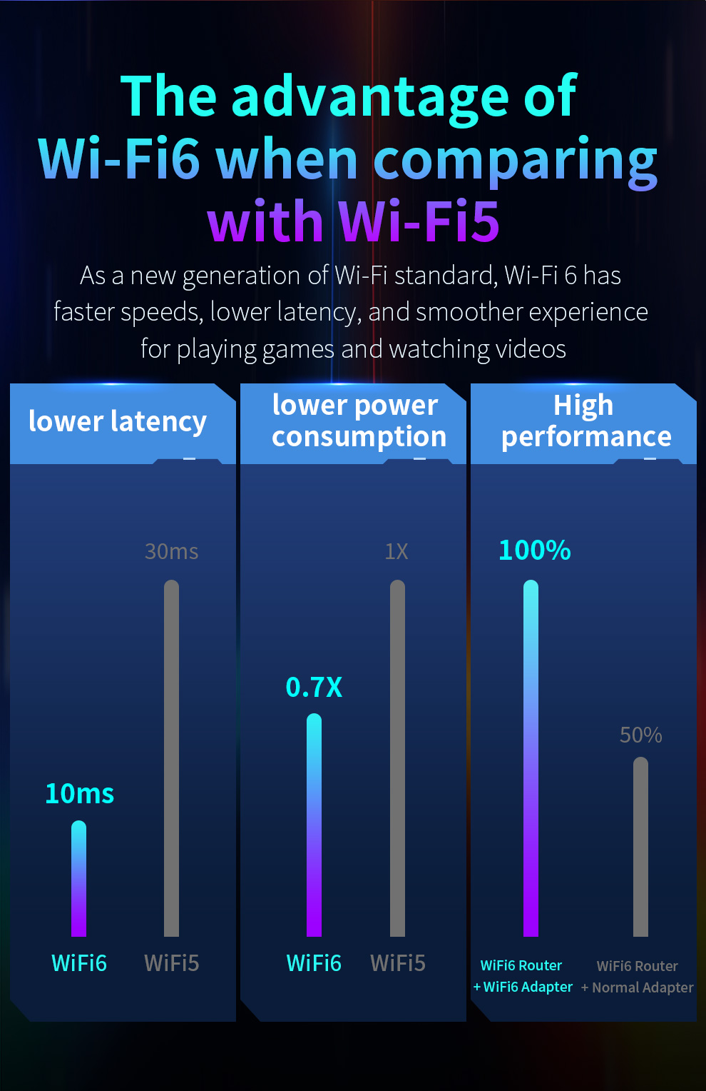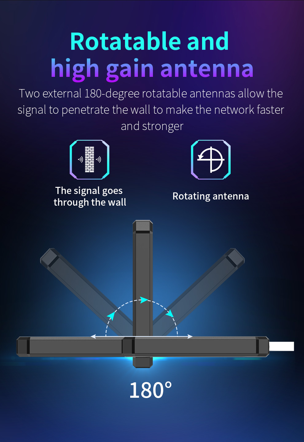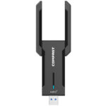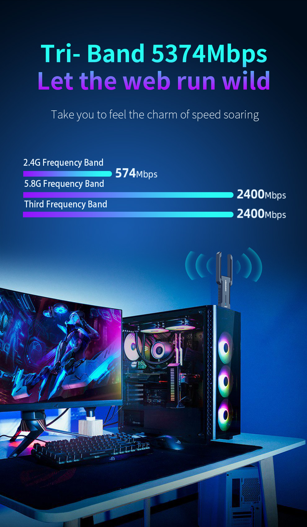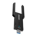 The CF-972AX is a driver-free WiFi 6 adapter built for gaming, delivering triple-band speeds up to 5374Mbps. Featuring rotatable external antennas and a side cooling design, it ensures extensive coverage and stable performance. Plug-and-play ready, it dramatically reduces latency and interference for a seamless, reliable connection in demanding gaming environments.