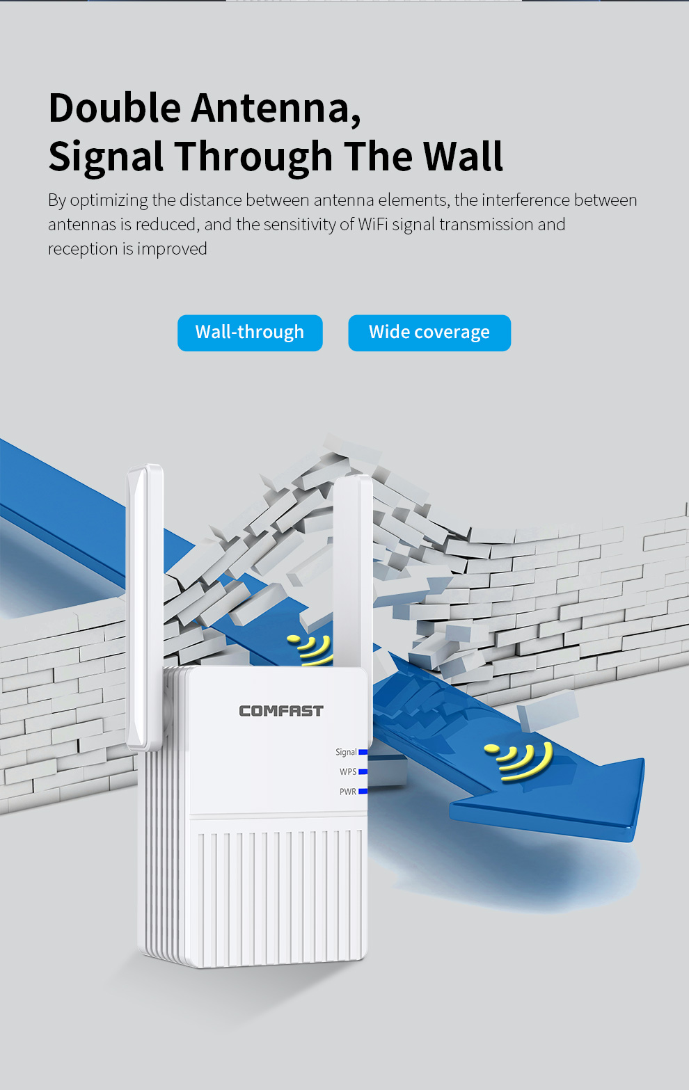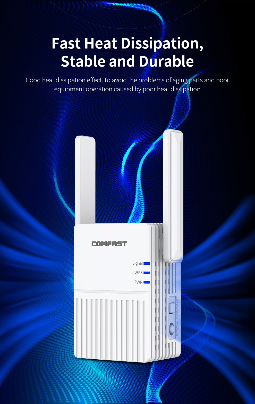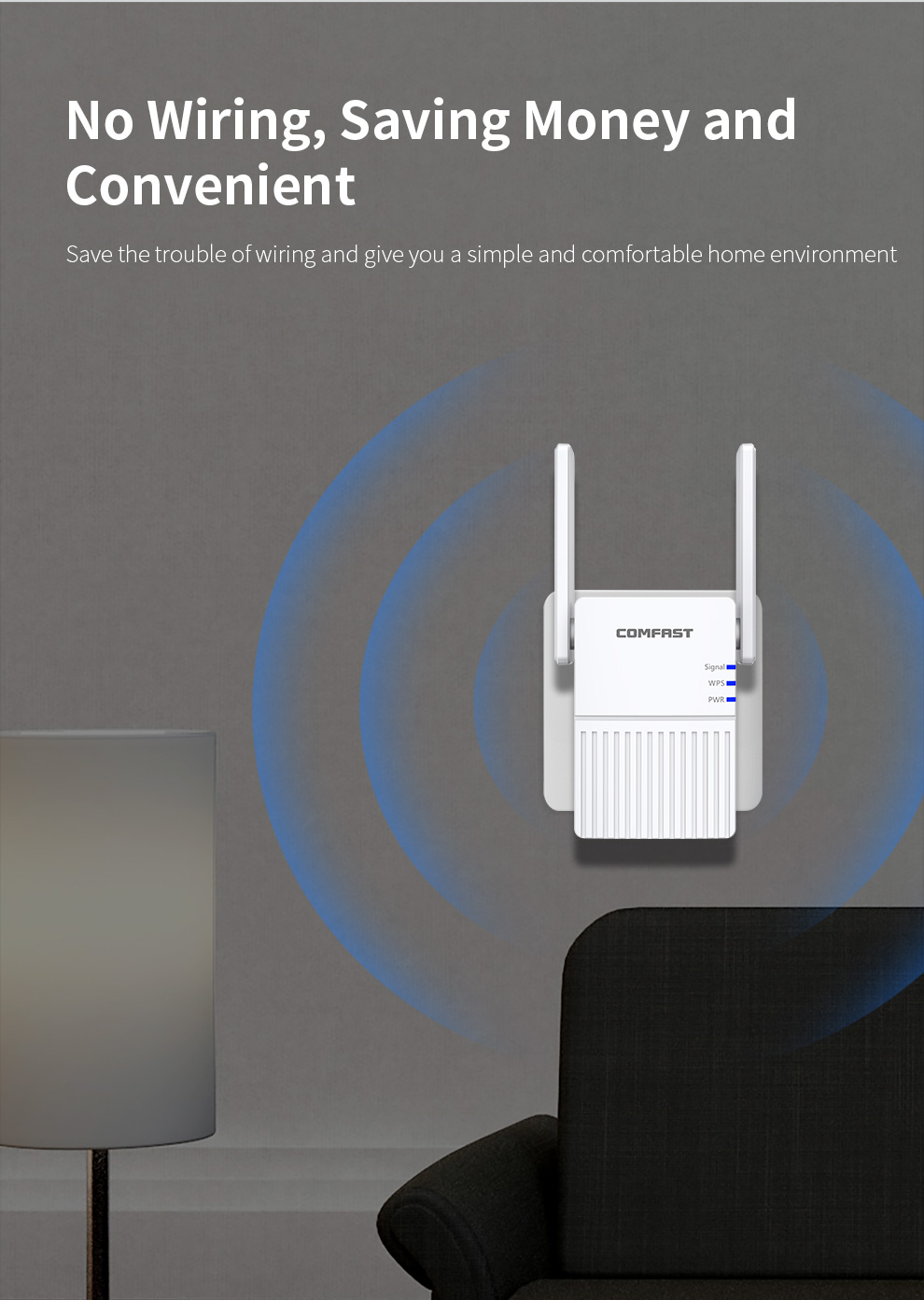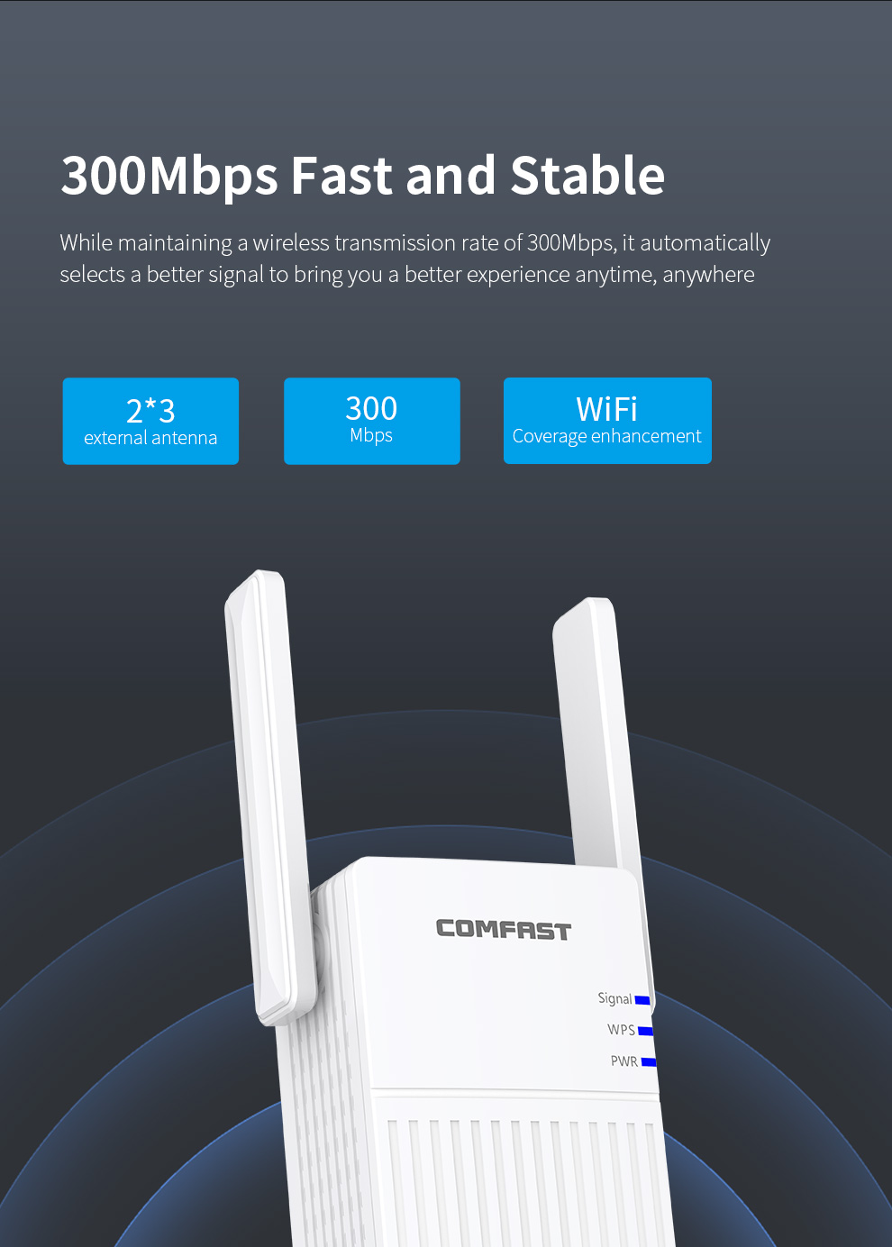 CF-N300 is a 300Mbps wireless signal extender with 2 external antennas to enhance signal transmission and reception sensitivity. The intelligent signal light can assist users in intuitively determining the optimal position of the repeater. The device supports memory transfer and easy setup, allowing users to easily extend their home router WiFi to any location they want through the repeater.