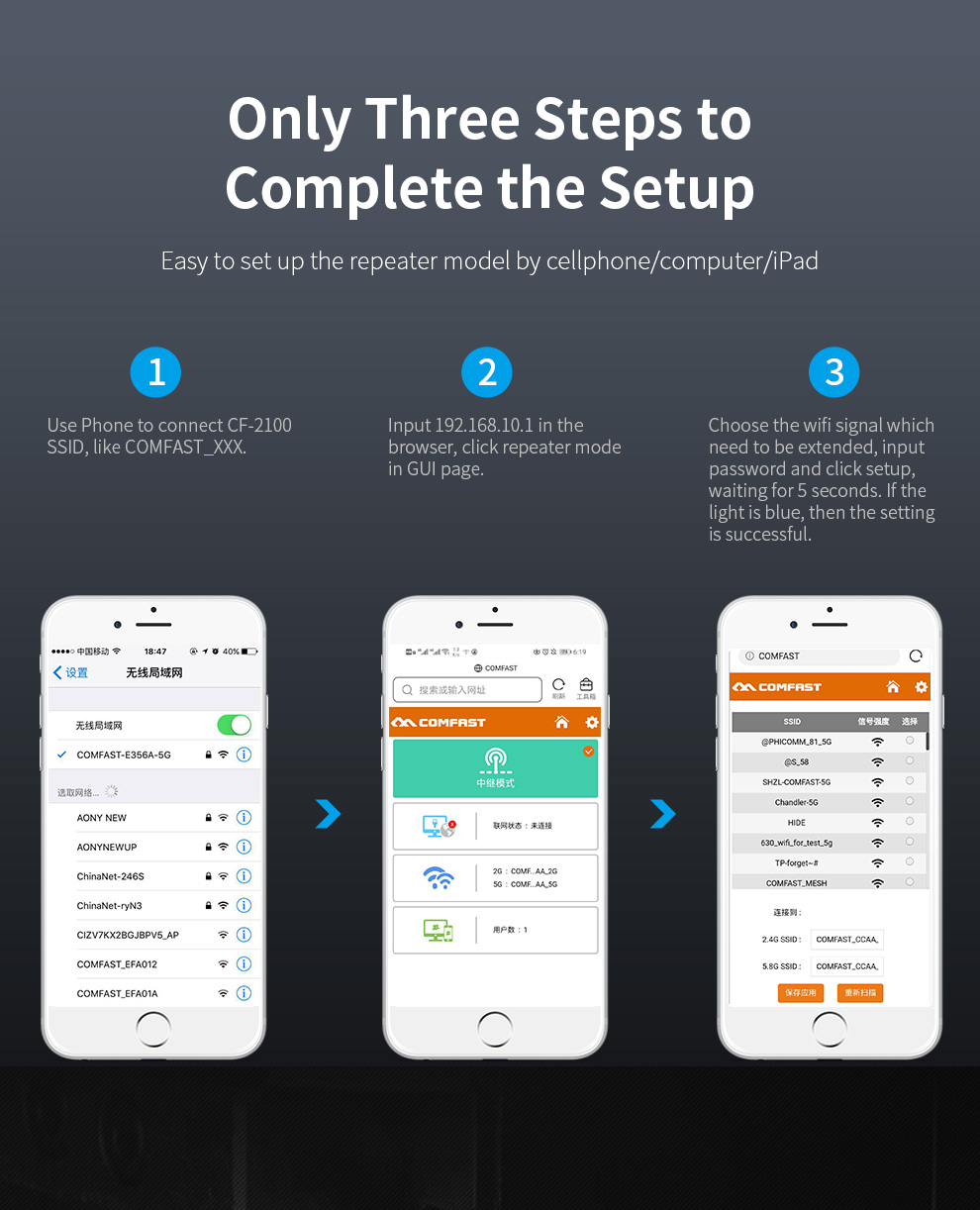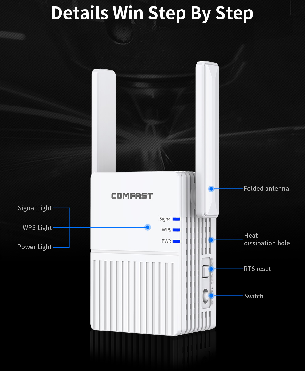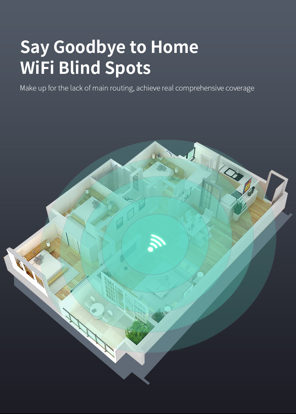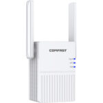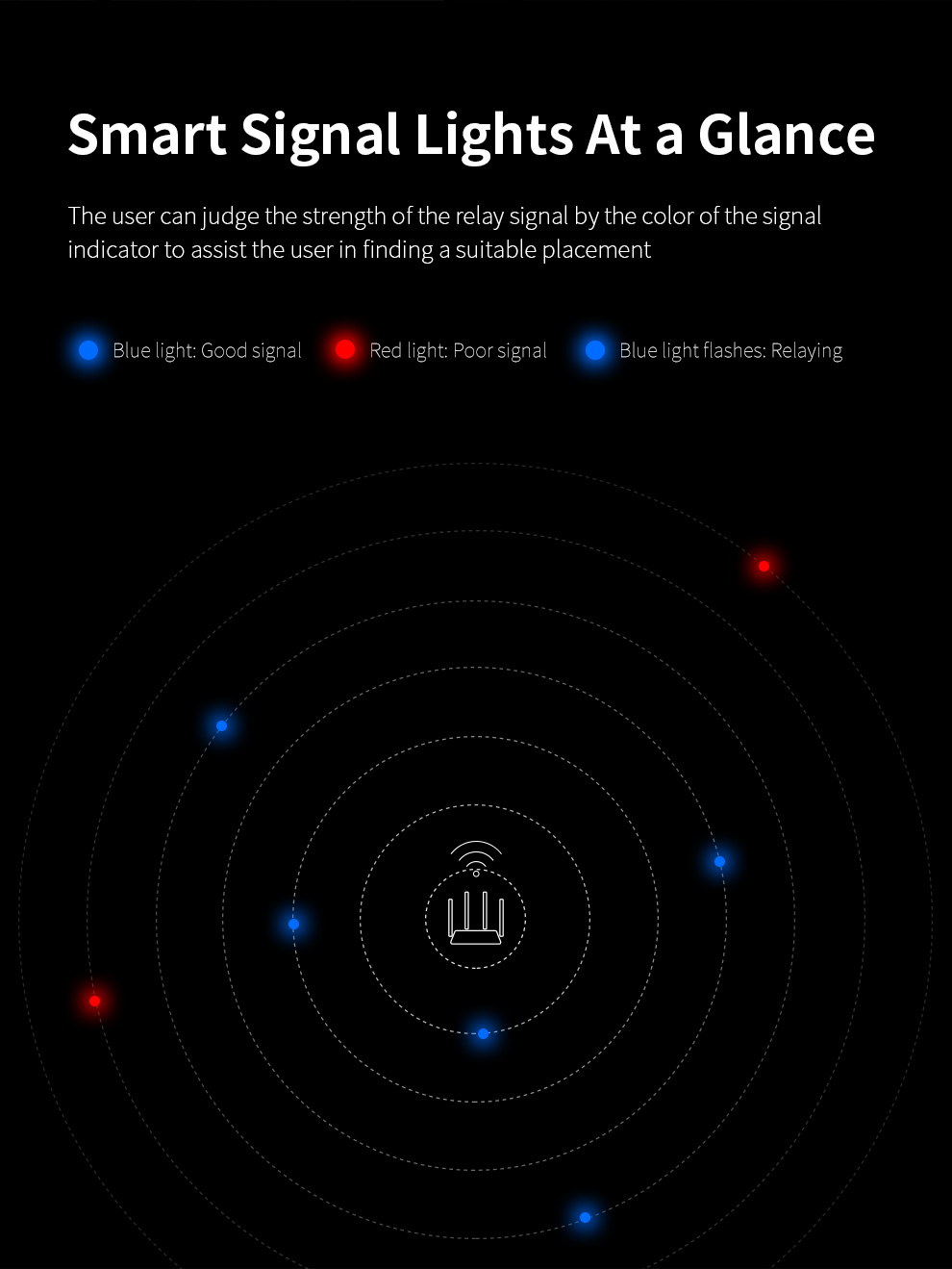 CF-N300 is a 300Mbps wireless signal extender with 2 external antennas to enhance signal transmission and reception sensitivity. The intelligent signal light can assist users in intuitively determining the optimal position of the repeater. The device supports memory transfer and easy setup, allowing users to easily extend their home router WiFi to any location they want through the repeater.