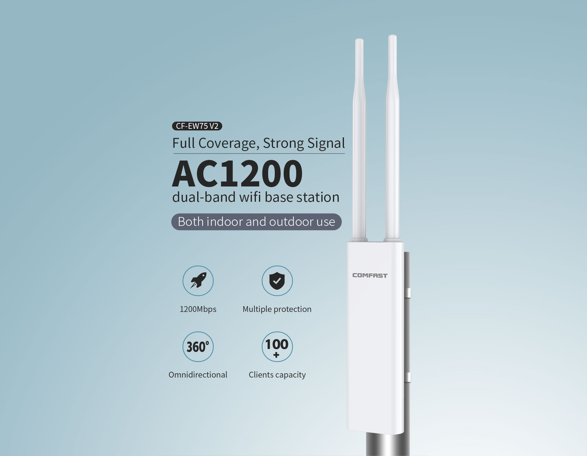 The CF-EW75 V2 is a 1200Mbps dual-band high-power outdoor AP designed for harsh environments. With an IP66 rating, high-gain omnidirectional antennas, and powerful signal amplification, it delivers wide-area, long-range coverage. Featuring flexible PoE support and Fat/Fit AP modes, it provides a high-speed, stable, and manageable wireless network for outdoor venues like parks, plazas, scenic areas, and residential communities.