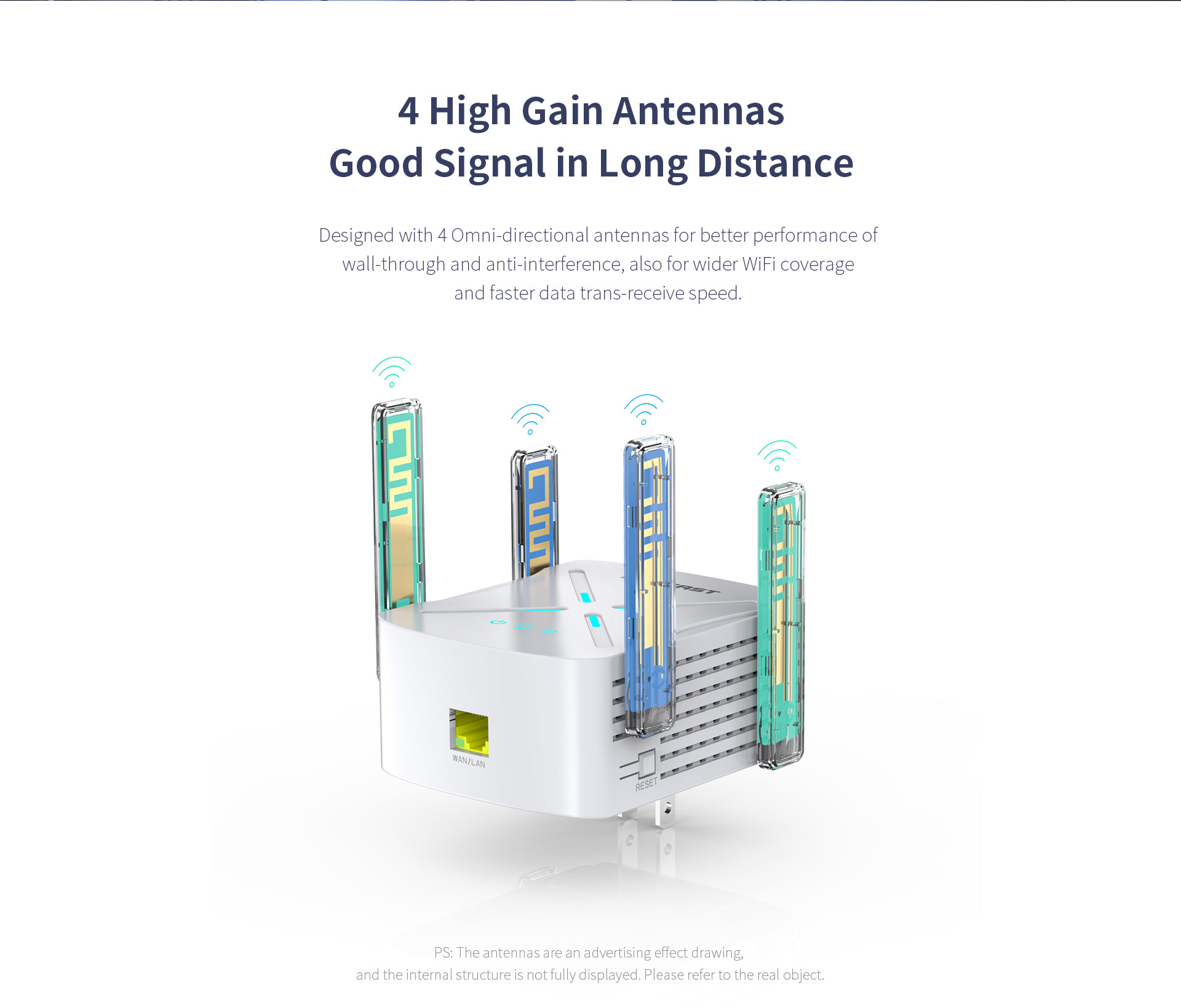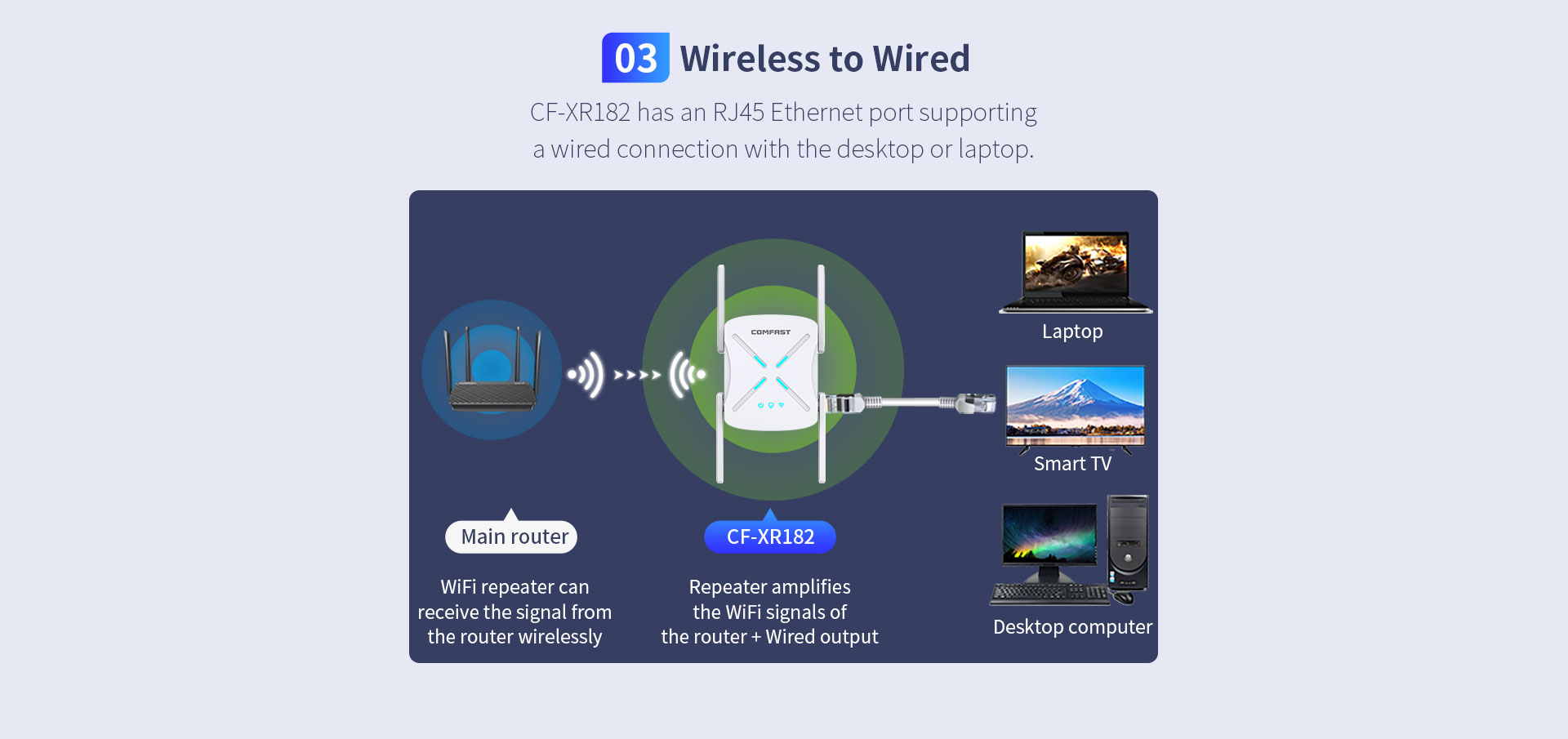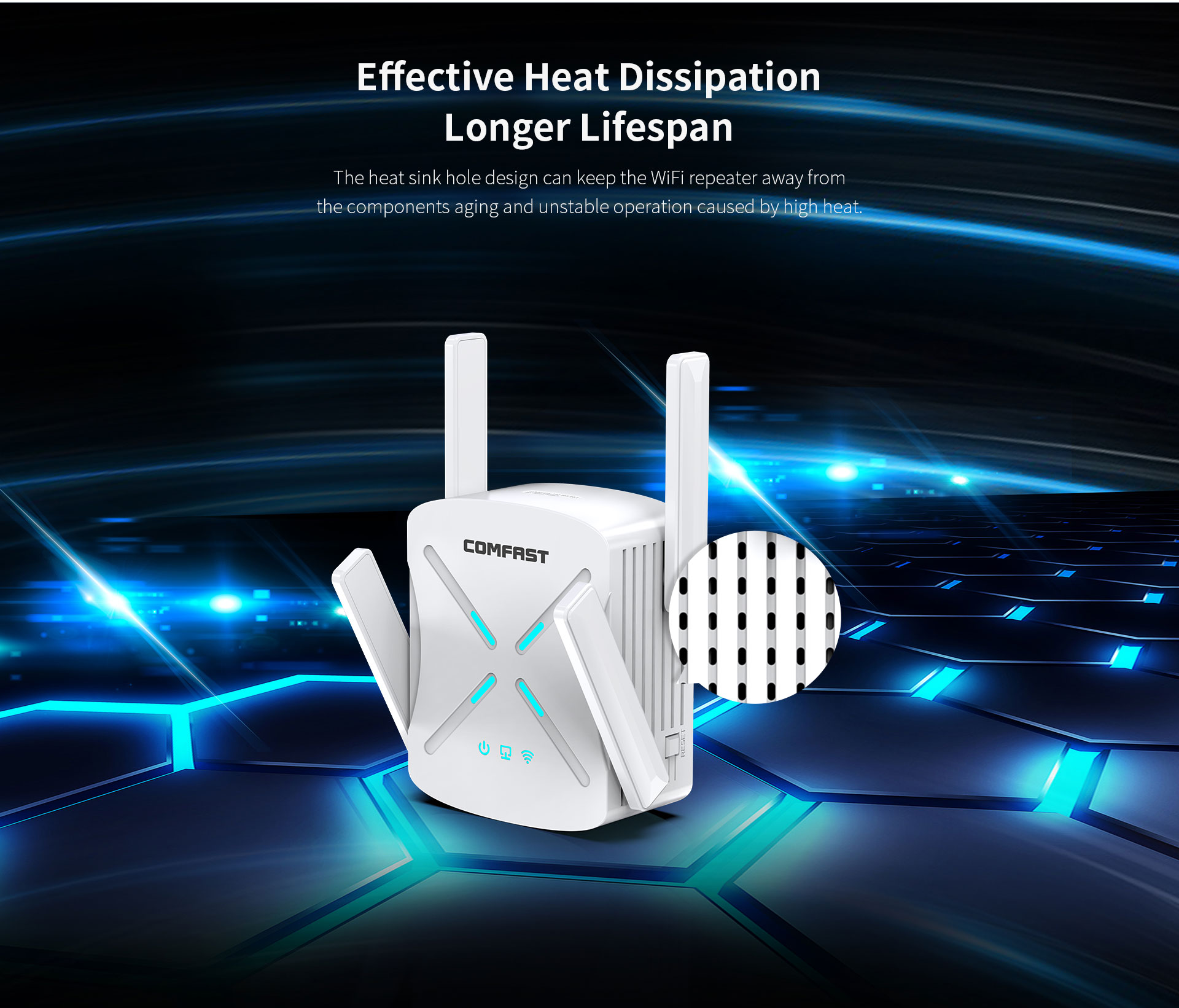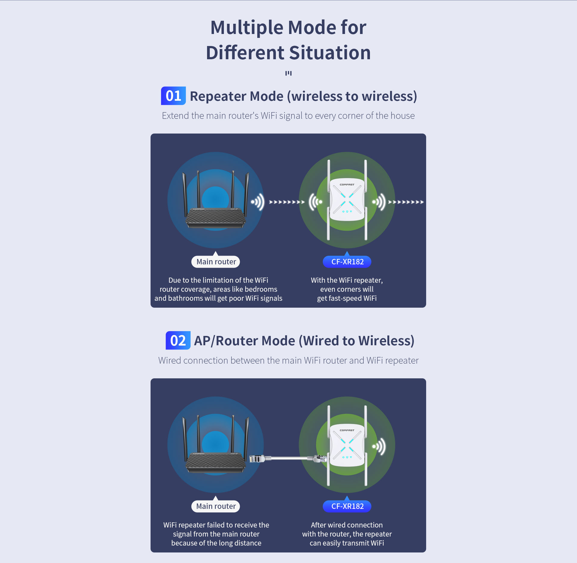 The CF-XR182 is a Gigabit dual-band WiFi range extender supporting the latest WiFi6 standard. Delivering combined speeds up to 1800Mbps and equipped with four high-gain antennas, it utilizes advanced wireless technology to significantly expand coverage and enhance wall penetration, offering a high-speed, stable, and whole-home network solution for large spaces.