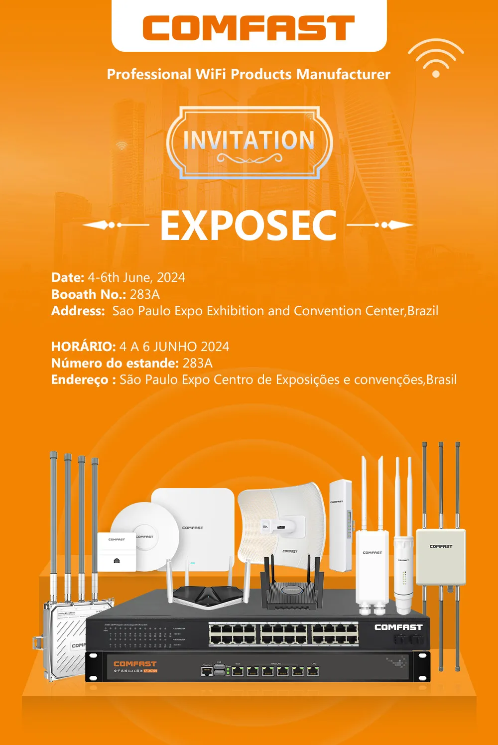 COMFAST, the wireless networking brand of Shenzhen Four Seas Global Link Network Technology Co., Ltd., invites partners and industry professionals to its booth at the 2024 Brazil Security Technology Expo (EXPOSEC), held from June 4 to 6, 2024, at the São Paulo Exhibition Center. COMFAST will be located at Booth 283A.