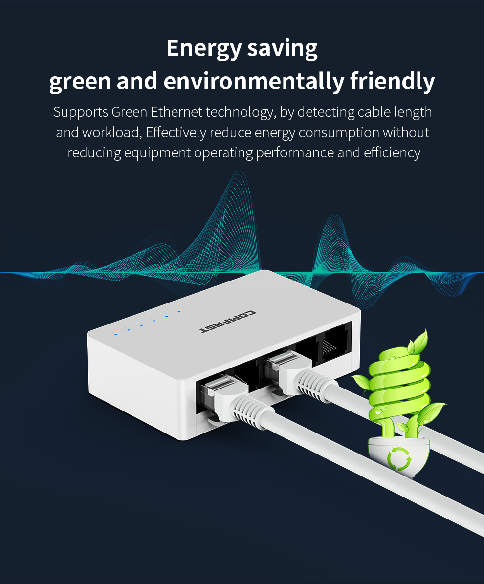 Supports Green Ethernet technology, by detecting cable length and workload, Effectively reduce energy